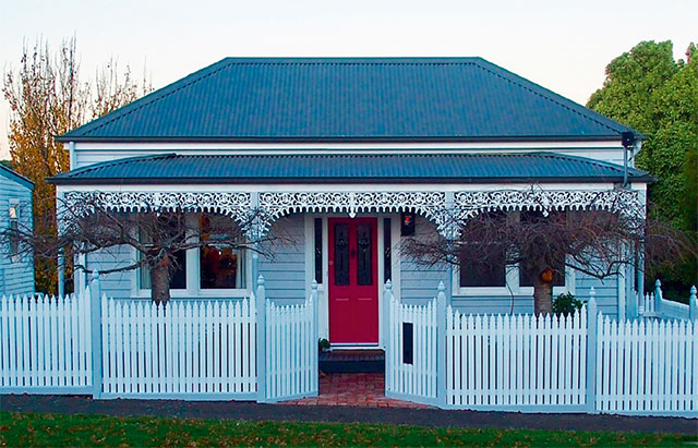 Homeowners Gareth and Kay gave their Victorian villa in Soldiers Hill a complete refresh with weatherboards and fence posts in Resene Surrender and trims and pickets in Resene Alabaster. We especially love their Resene Disco front door and their choice to paint the fence posts a contrasting colour from the rest of the pickets, though it’s their filigree trimmed awning that we’re particular envious of.