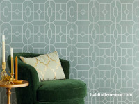 The clear, blue-toned green of Resene Wallpaper Collection 621020 will make a splash in any room. The design, which is a delicate scallop pattern, will add a touch of art deco glamour to your ocean-inspired look. Combine this richly hued wallpaper with timber furniture that has been stained in Resene Colorwood Uluru and cushions in a hue like Resene Flotsam. Try a brilliant colour like Resene Sea Green on an adjacent wall to play off the wallpaper’s colour and contrast it with Resene Double Alabaster on the skirtings and ceiling.