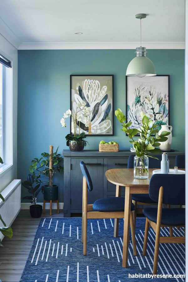 This striking feature wall, painted in Resene Breaker Bay, creates a separate space for the dining area in the this open-plan home. Artwork and furnishings thoughtfully tie into the relaxed beach theme. The ceiling, trims and surrounding walls are painted in Resene Black White.