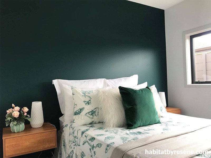 Rose worked with the Wellington Rugby team to bring every colour look together, resulting in a stylish overall aesthetic. In this bedroom, an accent wall in deep emerald Resene Atlas works a treat with touches of green soft furnishings. The other wall is painted Resene Half Athens Grey, the architraves are in Resene Quarter Foggy Grey and the ceiling is in Resene Alabaster.