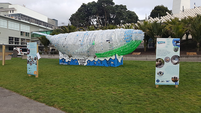 Ng?toro the Bottle Whale was created by Lorella from Rethinking Plastic Revolution and the Plastic Free July Taranaki team (a joint project of New Plymouth District Council, Para Kore, Enviroschools and Sustainable Taranaki) for Plastic Free July to raise awareness about single use plastics, especially plastic water bottles.