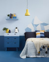 This child’s bedroom uses layering of blue tones to create a fun, fantasy world. The walls and ceiling are Resene SpaceCote Low Sheen waterborne enamel tinted to the aptly named Resene Quarter Frozen. For the deep Antarctic waters, the floor is painted in two coats of Resene Walk-On flooring and paving paint tinted to Resene Spinnaker. By tinting this same hue into Resene SpaceCote Low Sheen, the ‘water’ runs 75cm up the bottom of the wall to create an enveloping effect. Once the ‘water’ had dried, the main feature of the room, the iceberg painted headboard design was painted in Resene Sea Fog, Resene Frozen and Resene Blue Moon. Using Resene Lustacryl semi-gloss waterborne enamel, a durable formula that’s ideal for furniture, the dresser is painted in Resene Spinnaker and Resene Quarter Frozen. The bedside table is painted in Resene Frozen and a stool and a floating shelf carries that key colour from the iceberg off the wall and into the room. To infuse some energy, the pendant lamp, vase and pencil cup are painted in Resene Bright Spark to play off the golden yellow tones in the cushion and throw. Small accessories like plant pots and storage boxes are painted in Resene testpots in Resene Matisse, Resene Bullitt and Resene Frozen. Duvet, blanket and navy pillowcases from Citta, puppet from Toyco, throw from Freedom, Resene Living cushion from Briscoes, canvas shoes from Kmart.