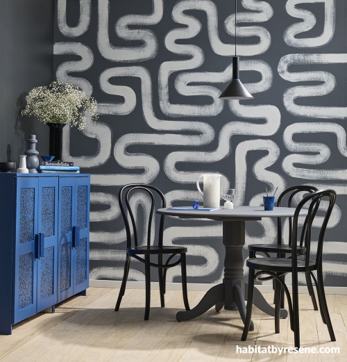 Embrace the trend for artistic flair with this eye-catching and simple-to-DIY wall design painted using the muted grey-blue of Resene New Denim Blue. The abstract brushstrokes are in neutral Resene Half Athens Grey to match the skirting. A cabinet in the much bolder blue of Resene Cobalt provides dramatic contrast and proves that not all interior blues must be soothing. Some are invigorating and energising conversation starters. The cabinet cupboard doors are painted with swirls in Resene Blackjack. Table in Resene High Tide, floor in Resene Colorwood Whitewash, tall vase with flowers in Resene Blackjack, middle vase in Resene High Tide and small vase in Resene Half Athens Grey. Project by Kate Alexander, image by Bryce Carleton.