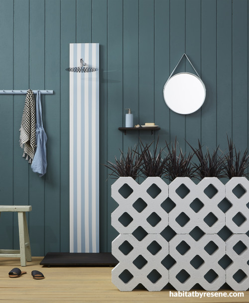 Beachy bathrooms in sea blues and sandy neutrals aren’t just for the bach. This resort-style outdoor bathroom invokes the sea with walls painted in Resene Green Meets Blue and a striped shower wall in Resene Nepal and Resene Sea Fog. Breezeblocks painted in Resene Sea Fog, shower stand and shelf in Resene Pitch Black wood stain, mirror in Resene Breeze with soap dispenser and hooks in Resene Nepal and wooden floor is Resene Natural. Project by Kate Alexander, image by Bryce Carleton.
