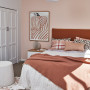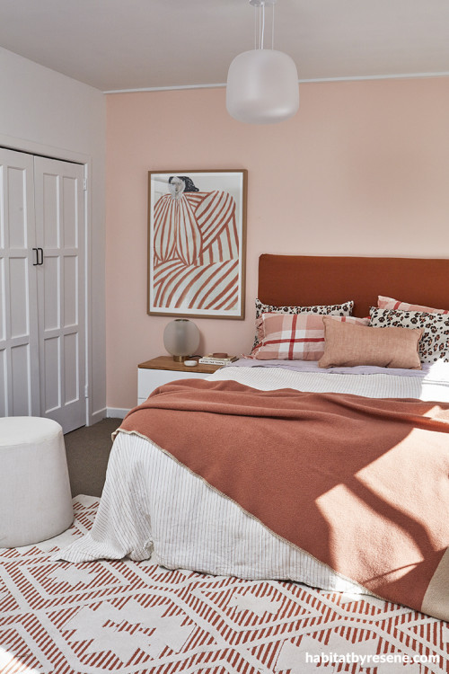 Amber kept her colour palette ‘tight’ with a feature wall painted in Resene Tuft Bush and adjacent walls, cupboards and ceiling in Resene Half Sea Fog. Further terracotta tones are introduced through the bedding, art and rug mirroring the colours Resene Tuscany, Resene Tuft Bush and Resene Brandy Rose.