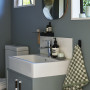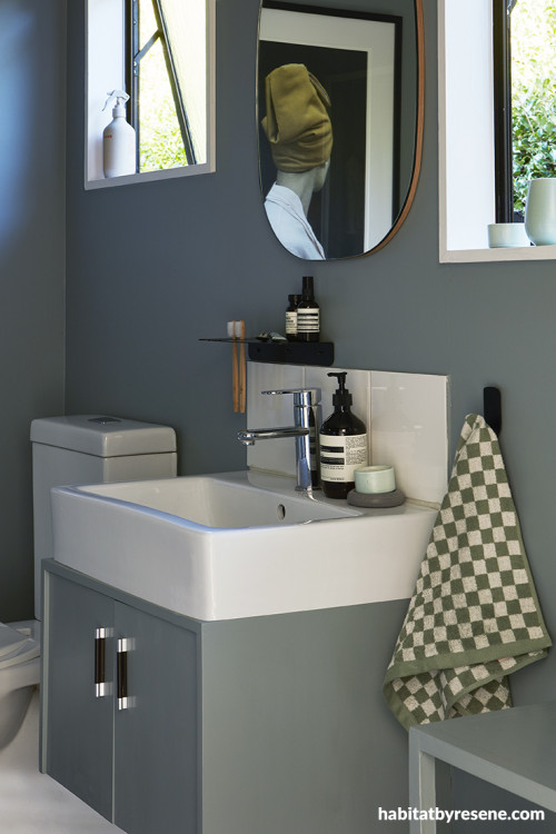 Bathroom walls and cabinet painted in Resene Inside Back and trims in Resene Half Sea Fog. “When it was painted white it always felt quite clinical – no matter how many plants I threw at it,” says Amber.