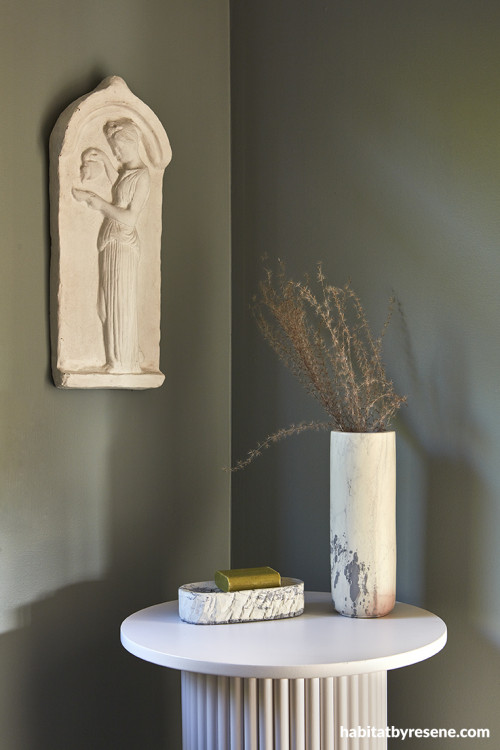 The bathroom posed the biggest decision for Amber. After ‘umming’ and ‘aahing’ for some time the colour inspo came from a ceramic wall sculpture, reminding her of her time spent in Turkish and Moroccan baths. She used moody grey and green tones, including Resene Inside Back and Resene Half Sea Fog, that ended up changing the whole feel of the room, which also doubles as a laundry. It’s become one of Amber’s most loved rooms in her home.