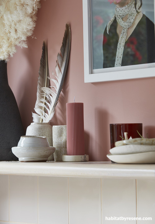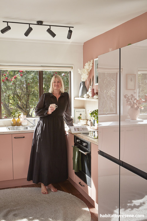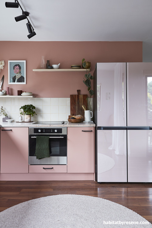 One of the most striking rooms in the house, a feature on its own, is the kitchen. Amber chose pink again but this time chose to go with a more mushroomy pink, a colour that was not too ‘feminine’. After painting the cabinets in Resene Brandy Rose, she enjoyed it so much she continued it up the walls.