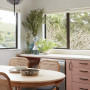 This second-hand table was rejuvenated with a leg saunter painted in Resene Envy. The kitchen cabinets are painted in Resene Brandy Rose and the wall and trims are Resene Half Sea Fog.