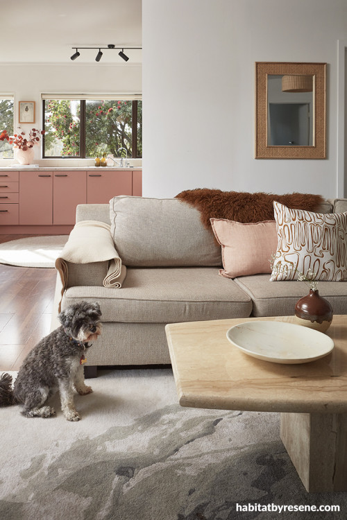 The living room walls are painted in Resene Half Sea Fog, with the kitchen peeking through in blushing Resene Brandy Rose. Ceiling and trims in Resene Half Sea Fog.