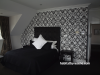 Black and white linen and a black headboard are paired with black and white patterned wallpaper by Vision Wallcoverings, available from Resene.