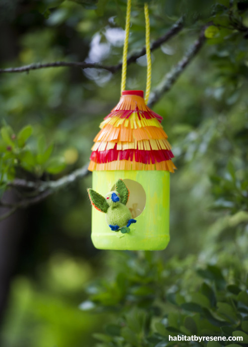 The bird feeder is made with an empty Janola bottle for the body of the feeder (make sure you wash it out well), and a milk container cut into fringed strips for the roof. It’s decorated using Resene testpots in Resene Hi Jinx, Resene Rocket, Resene Bright Spark, Resene Kermit, Resene Dizzy Lizzy and Resene Neva.