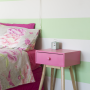 Inspired by a milkshake straw, Anna painted stripes onto daughter Charlie’s walls using Resene Half Ecru White and Resene Tutti Frutti from the Resene KidzColour range.