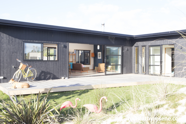 The exterior of the house is clad in Shadowclad and painted in Resene CoolColour Black. Says Anna: “Resene CoolColour is great. The deck gets hotter with the sun than the black walls.”