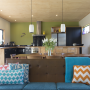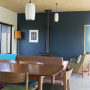 Resene Elephant is a deep green-edged blue, used as a feature wall in the living room, and joined by a cavity sliding door in Resene Marathon. The chairs for the retro dining table were reupholstered in multi-colours by Anna.
