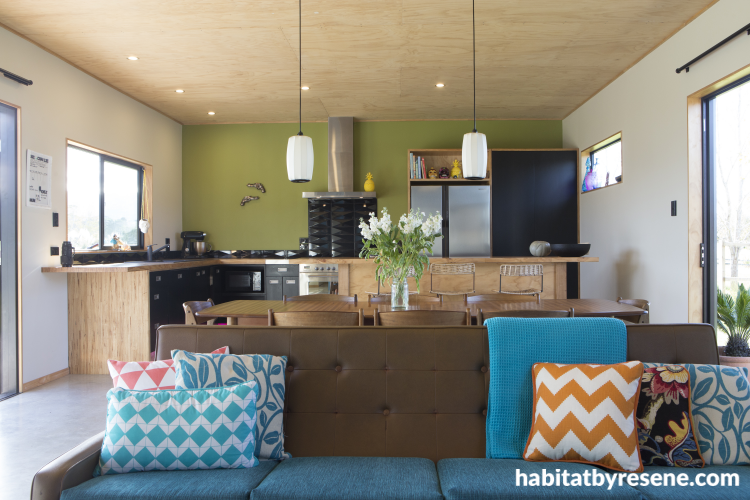 Resene Kombi is a warm green backdrop to the kitchen. The cabinets were bought second-hand and resprayed, while the unusual bench is LVL (laminated veneer lumber).