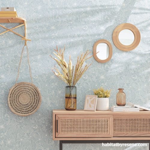 If you’ve got a small living and dining space, create a focal point like this feature wallpaper strip, which works to split up the space and give the illusion of two rooms instead of one. The vertical pattern also makes the room look larger and draws the eye up. To ground the space, and emit a ‘sand and sea’ palette, add warmth through natural materials like wooden furniture and flooring finished in Resene Colorwood wood stain, rugs and artwork. Take shades from within the wallpaper to use on surrounding walls and create a cohesive look. Try colours like Resene Paris White, Resene Loblolly and Resene Breeze.