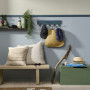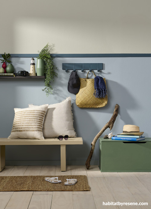 Bring the healing tones of greens and blues into your home with this beach-inspired palette. Upper section of wall painted in Resene Linen, dado rail in Resene Atomic, lower wall in Resene Dusted Blue, skirting in Resene Half Inside Back, floorboards in Resene Colorwood Breathe Easy, smallest vase in Resene Flax, twin bulb vase in Resene Half Pohutukawa, ribbed vase in Resene Seaweed, wall hooks in Resene Atomic, bench seat in Resene Double Pavlova and blanket box in Resene Rivergum. Rug from Nest-direct.com. Project by Moneuan Ryan, image by Bryce Carleton.