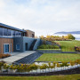 So he wrapped the house with sculptural forms of lawn, grasses, retaining walls and the creek, which terminates in a curved pond animated by low waterfalls.