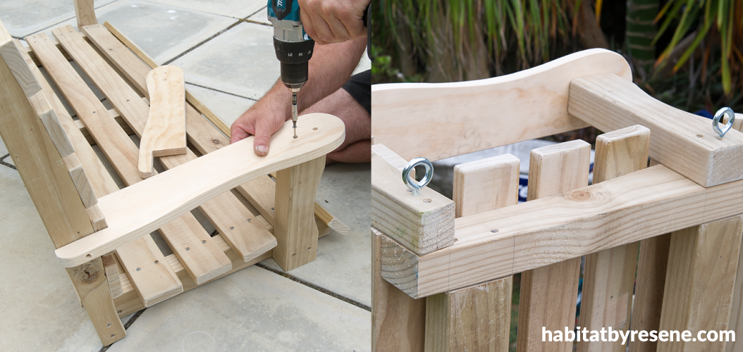 Attach the arm rests and the self tapping screw eyes, as shown in gallery.