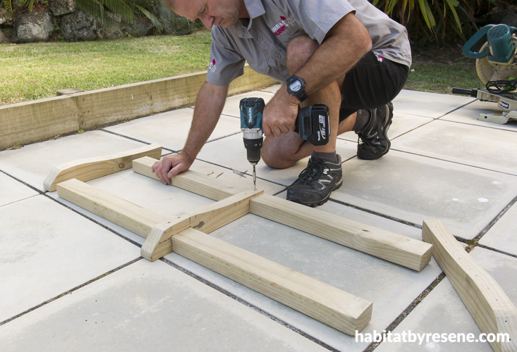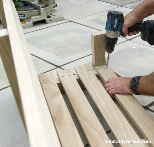 Cut slats to length, and note that two of them are going to be shorter to go inside the uprights and one of those will have a notch jigsawed out of the centre to fit over the back frame. Screw slats into place, using the narrow edge of a slat as a spacer.