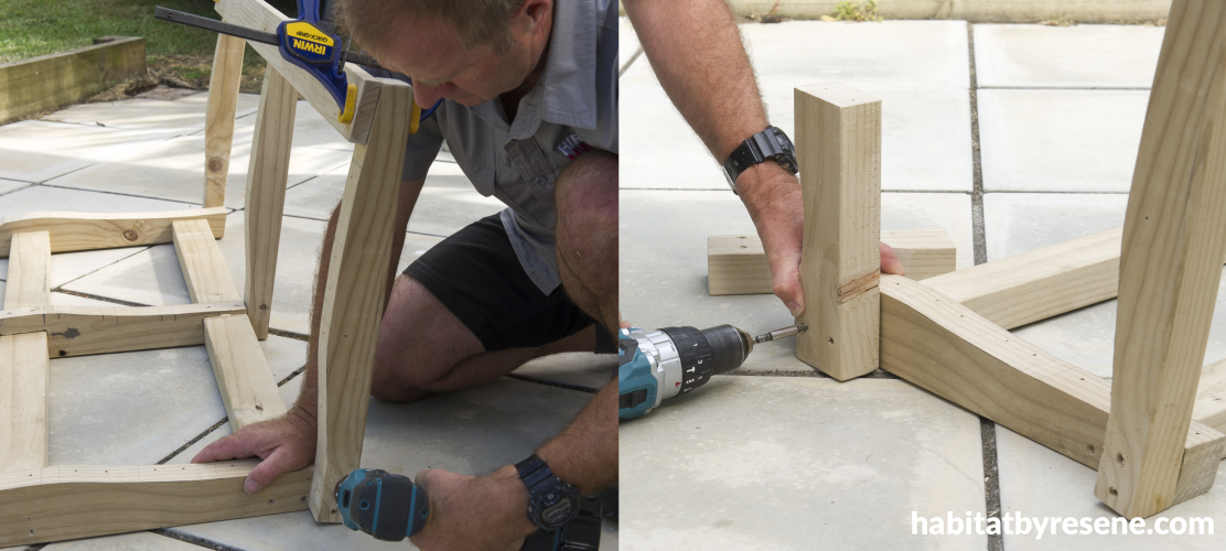 Start with the seat. Make the frame for the seat base, using our photograph as a template (above), or use straight pieces if preferred. Sand any cut edges. Pre-drill the holes so that the screws can counter-sink for a neater and more comfortable finish, and use the glue for extra strength.