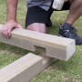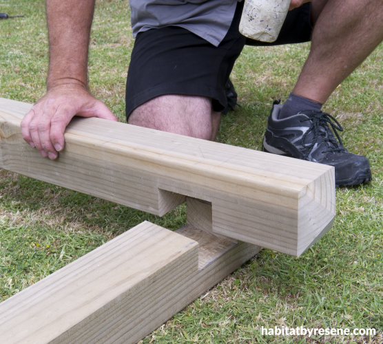 Cut opposing notches into the top beam (130mm from the ends) and posts with a circular saw and chisel. Drill holes for the coach bolts. Slot the beam and posts together, using a mallet. We cut 30 degree bevels on the ends of the top beam which not only looks good but stops water seepage into the timber’s end grain. Or you can leave the beam plain. Add the eye bolts to the underside of the top beam, 40mm in from the posts. They go close to the posts so that the rope stays out past the seat arms.40mm in from the posts. They go close to the posts so that the rope stays out past the seat arms.