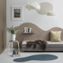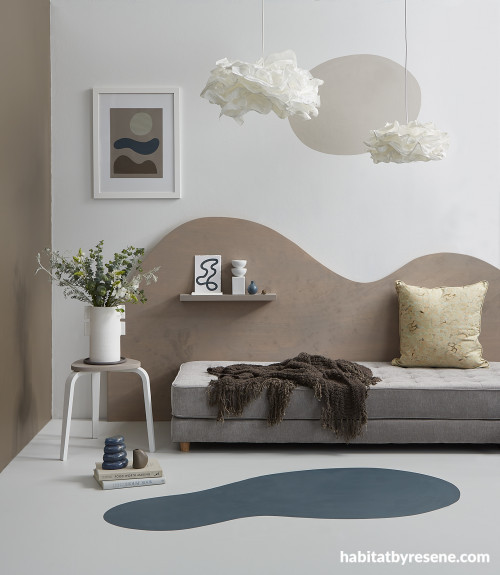 Does your living room let you live your best life? Allocating a quiet corner as a reading nook could make all the difference to its functionality, allowing your family to turn on the TV in one zone, while you escape into a story in another. The beauty of an open-plan set-up such as this is that you’re separate, yet connected, within cooee of your partner or with one eye on the kids. On this main wall and floor respectively, Resene Half Athens Grey (a soft pearl grey with a touch of violet) and dawn-mist grey Resene Quarter Delta are a blank canvas for the repetition of a curvy motif that’s echoed in the DIY artwork and painted objects. Welcoming shapes in Resene Quarter Perfect Taupe (right wall), Resene Colorwood Riverstone (headboard) and Resene Atomic (floor) and playful pendant lights combine to set a whimsical scene that’s distinct yet neutral enough to gel with the rest of the room.