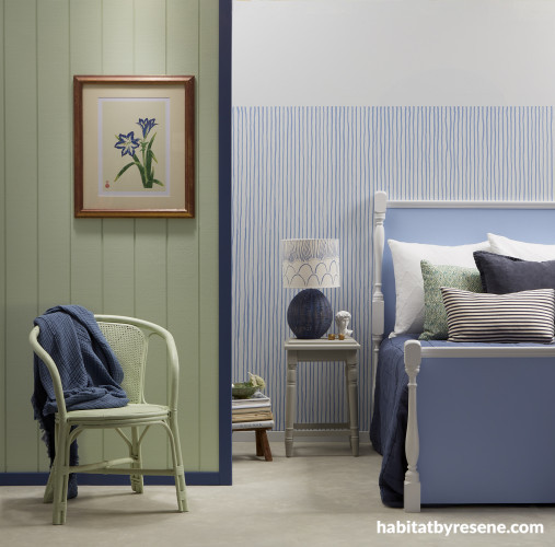 Right wall in Resene Surf Crest and Resene Astronaut (trim), left wall in Resene Mystic and Resene Relax (stripes), floor in Resene Mystic with Resene Paint Effects Medium tinted with Resene Dusted Grey. Chair in Resene Surf Crest, bedside table in Resene Dusted Grey chalk paint, lamp in Resene Zephyr (shade) and Resene Astronaut (base), headboard in Resene Relax and Resene Quarter Iron (uprights). Artwork by Bioattic from Endemic World, throw and white Euro pillowcases from Places & Graces, stool and bowl by Tony Sly, bust from Ornament, dice from French Country Collections, green cushion from Collect Living, striped pillowcase from Thread, bedspread from H&M Home. All other items stylist’s own. Project by Kate Alexander, photography by Bryce Carleton.