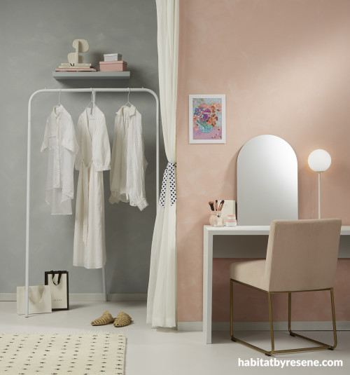 Flex your star power and install an old-Hollywood-style dressing room to take the pressure off in the mornings and provide a place for a little pampering at night. Picture yourself serenely preparing for your day or transitioning into your downtime without anyone banging on the bathroom door, in just the right light and with enough room to keep everything you need within reach. This space could be recreated in a corner of your bedroom or in a guest room. Floaty fabric and a candy colour are the heroes of the scheme, achieved with a curtain from Resene and peach-blossom Resene Sakura paint, teamed with winter-grey Resene Loblolly and lime-chalk Resene Snow Drift to subtly blend feminine and masculine. Both walls have been given a textural treatment with Resene Paint Effects Medium for a sense of softness enhanced by warm, flattering lighting. Paint the floor (we used paler grey Resene Mercury), then add a rug to up the luxe underfoot.
