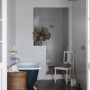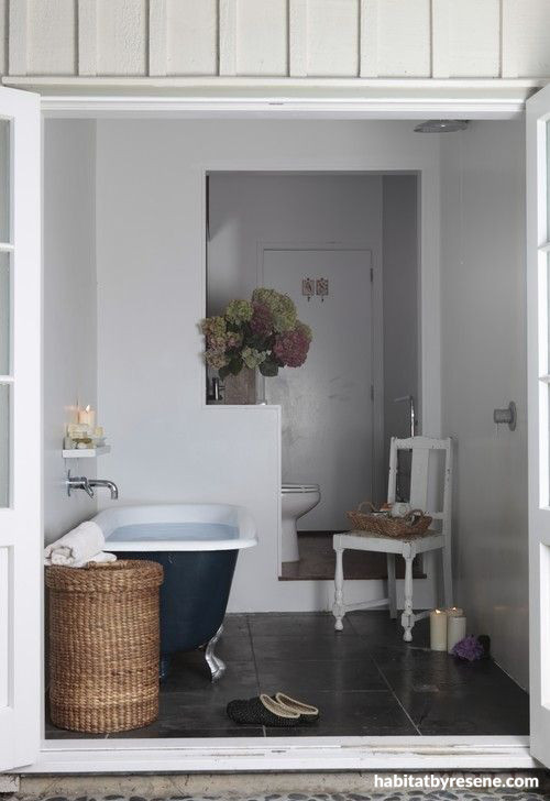Bath in Resene Armourcote, with Resene Magnum and Resene Silver. Wall in Resene Alabaster and trim in Resene Half Alabaster. Photography by Charlie McKay.