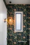 The guest toilet walls have a moody tropical sunset vibe; Resene Wallpaper Collection 90222 has just enough colour for a pop of brightness, against the ceiling, doors and trims in Resene Alabaster.