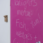 Interior designer Jackie Jones used Resene SpaceCote Low Sheen tinted to Resene Pink Panther to create a menu board out of a door in her kitchen.
