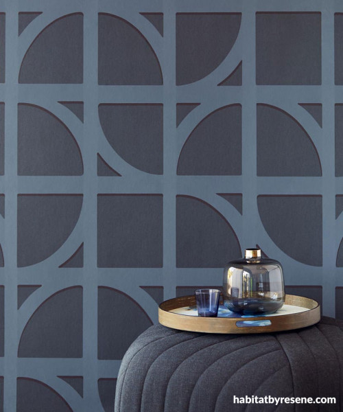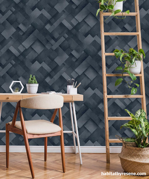 The colour of night skies, Resene Wallpaper Collection E395805 creates a Great Gatsby-esque look in this living space. Try pairing this wallpaper with velvet furnishings and gold or metallic pieces to complete the luxe look. You can repaint existing accessories in Resene Gold metallic paint to add a touch of luxe.