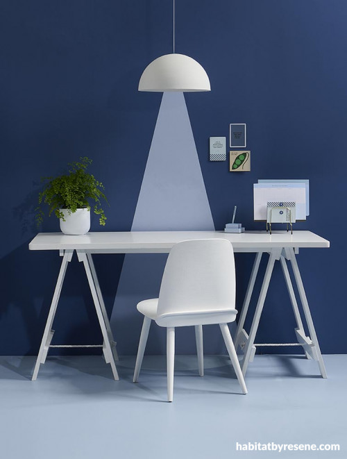 This study space is jam-packed with charisma with a paint feature descending from the light (think UFOs, perfect for a night sky theme). Walls painted in Resene Astronaut and Resene Echo Blue, floor in Resene Oxygen and lightshades in Resene Alabaster. Project by Emily Somerville-Ryan, image by Bryce Carleton.