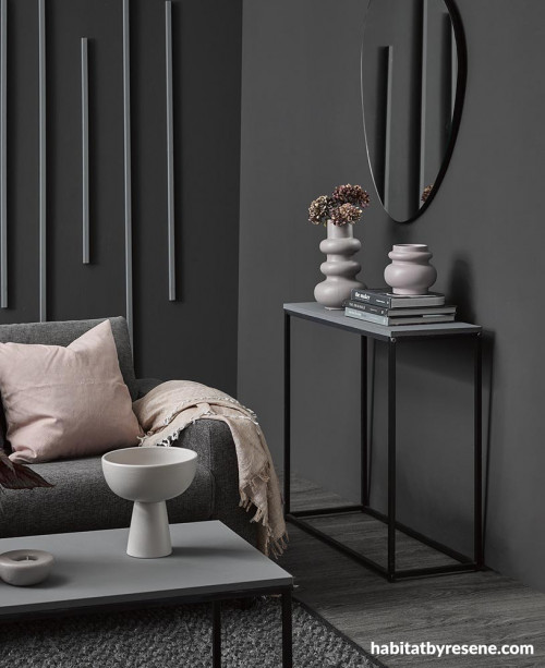 Richer, darker hues can feel luxurious, brimming with moody, timeworn comfort. A cocooning ambiance is synonymous with softness and calm. Floor stained in Resene Colorwood Dark Oak, walls in Resene Nocturnal, battens in Resene Half Tuna. Coffee and console tabletops in Resene Half Tuna, sculptural object in Resene Blue Smoke with plinth base in Resene Nocturnal, tealight holder in Resene Yucca, vase in Resene Nebula and textured vase in Resene Yucca. Sofa from King Living, mirror from Freedom, cushion cover from H&M Home, throw from Allium. Project by Vanessa Nouwens, image by Wendy Fenwick.