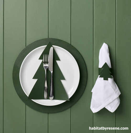 While we have chosen a tree shape, you could try a large star, snowman, or even a large bell. Combine your shape with your own favourite Resene colour, or colours, to create your own unique table setting! Try a different take on a Christmas green by opting for a turquoise like Resene Surfie Green and Resene Blue Lagoon, or a terracotta shade instead of red, such as Resene Apple Blossom and Resene Tuscany.