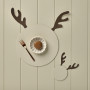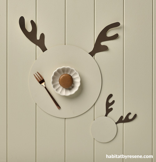This playful and jolly table setting features a placemat and coaster with reindeer ears. The table is painted in Resene Tea and small dish in Resene Rice Cake with placemat and coasters in Resene Tea and Resene Oilskin ears.