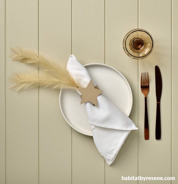 - Resene testpots in your chosen colours – we used Resene Rodeo Drive for the DIY star napkin holder, Resene Forest Green for the tree setting and Resene Rice Cake, Resene Tea and Resene Oilskin for the reindeer setting