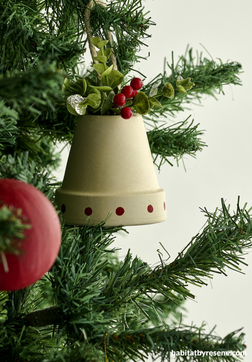 Step 3: Glue any festive embellishments onto the tops of the pot using clear craft glue and add any extra patterns you like with other Resene paint colours. We added dots in Resene Red Berry.