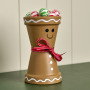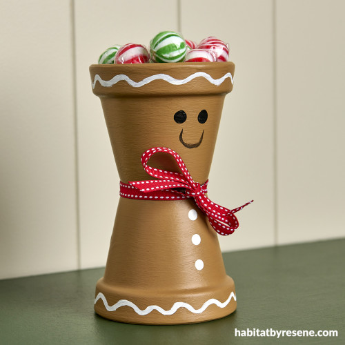 Our gingerbread man treat pot is painted in Resene Brown Sugar, with Resene Half Rice Cake and Resene Black Sand features. The wall is painted in Resene Tea and table in Resene Forest Green.
