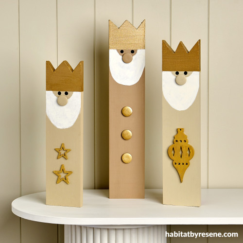 If you have a piece of wood lying around the garage or workshop, then this cute project creating three wise men could be worth a go. These make a great decoration for a centre piece, on an entry table or on a dining buffet! While we have chosen a fairly neutral colour palette with hints of gold, you can paint yours any colour you like, such as bright red and green using Resene Havoc and Resene Crusoe.