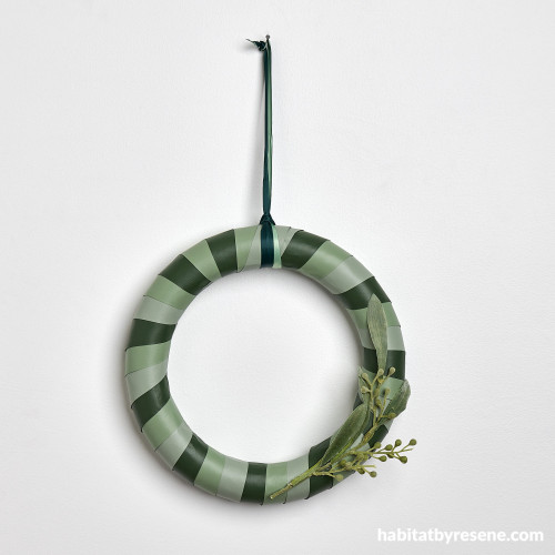 Get creative with cardboard strips and make your own wreath! Ours is painted using Resene Pumice, Resene Forest Green, Resene Spanish Green and Resene Xanadu. Wall painted in Resene Black White.