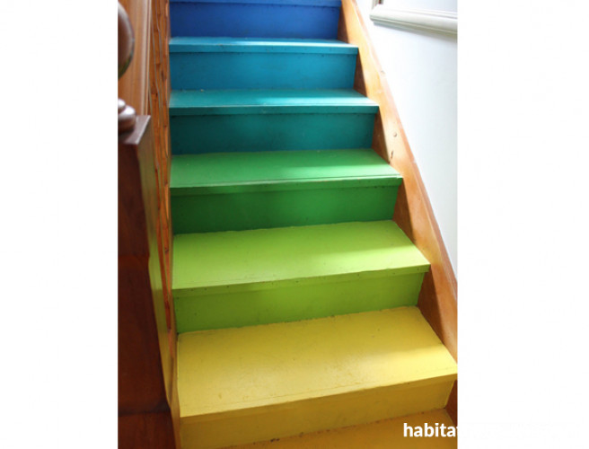 Clever homeowner Pippa Jinks ripped up the old grey carpet on her stairs, grabbed some Resene testpots, and converted the steps into a rainbow.