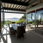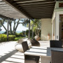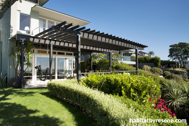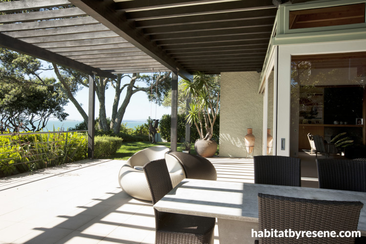 Brown and cream outdoor furniture work perfectly with the house's colour scheme. The body of the building is Resene Washed Green, while the soffits, eaves and struts are Resene Half Lemon Grass. The window and door frames are Resene Half Tea. The pagodas, posts and fascia boards are Resene Shadow Match.