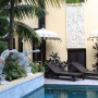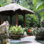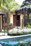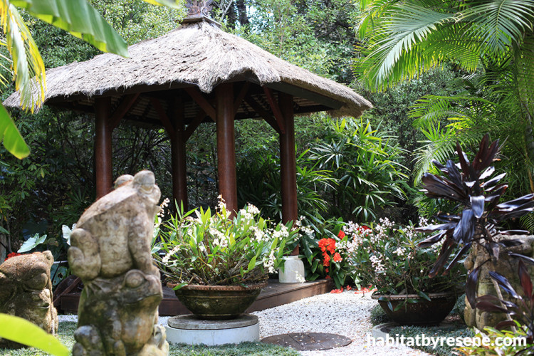 Water is a big feature in the Balinese-style garden. The exterior is painted in Resene Coyote. The posts and beams are stained in Resene Woodsman Treehouse.