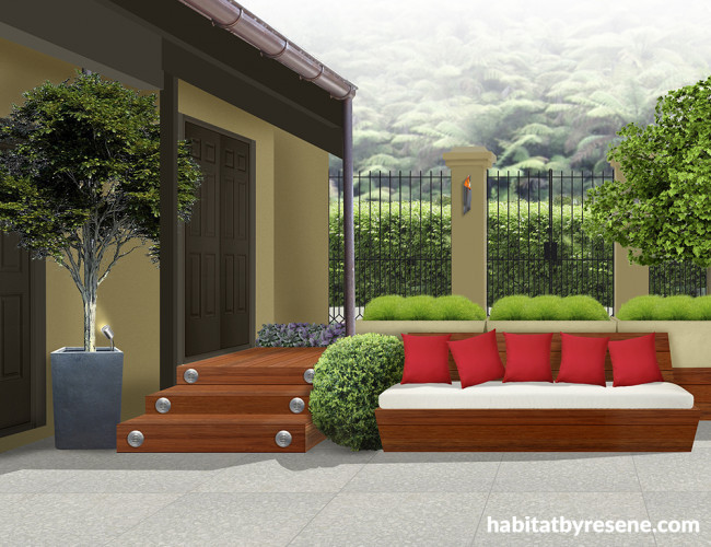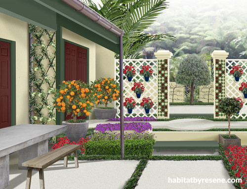 We asked Tania Barke of Through the Garden Gate for an alternative scheme for the garden. She suggested adding a bit of the magic of the Mediterranean, with mandarin potted trees guarding the main door, and a trellis holding geraniums in Resene Zinzan pots.