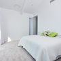 Even the carpet, linen and furniture in the bedrooms is white, echoing the Resene Half Black White walls and ceiling.