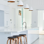 The five-metre long kitchen island is one of the owner’s favourite aspects of the house. The intriguing splashback is one of the owner’s artworks.