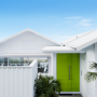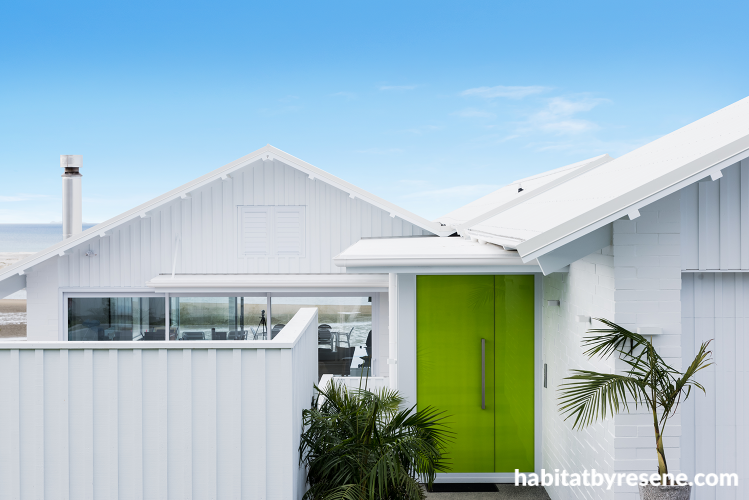 The house’s all-white scheme in Resene Black White is broken only by the vibrant lime green front door, in Resene Wellywood.